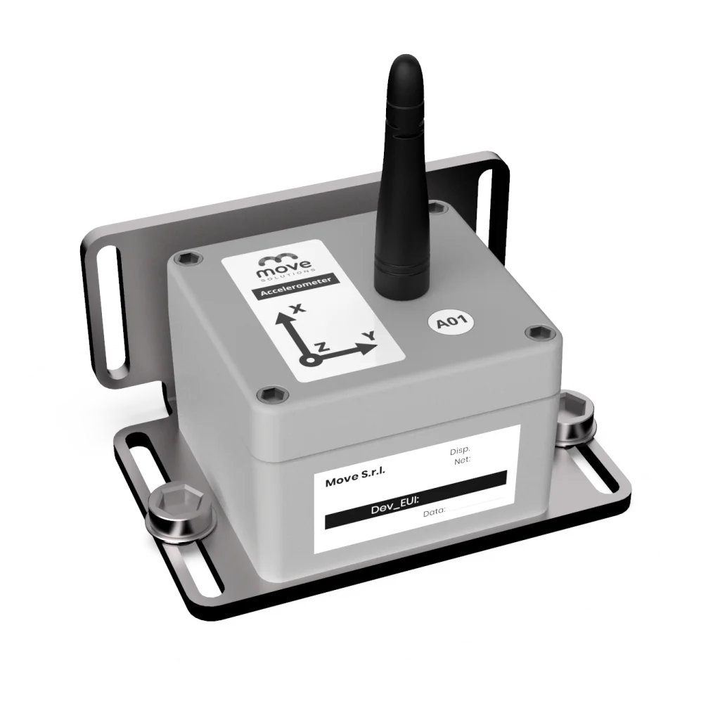 Wireless triaxial sensor for acceleration monitoring The accelerometer is a wireless, battery-powered sensor designed to capture structural vibrations and acceleration events in three axes. With a compact, rugged design and LoRaWAN connectivity, it operates autonomously and is easy to install. It allows engineers to perform dynamic assessments, identify modal frequencies, and monitor vibrational behavior over time via the MyMove IoT Platform.